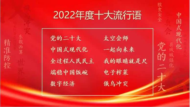 2022년 10대 류행어는 20차 당대회, 중국식 현대화, 전 과정 인민민주, 중국 밥그릇 잘 받쳐들기, 디지털경제, 우주합류(太空会师), 함께 미래로(一起向未来), 내 눈은 바로 자(我的眼睛就是尺), 전자자차이(电子榨菜), 로씨야-우크라이나 충돌이다.