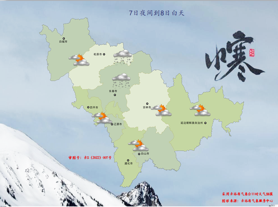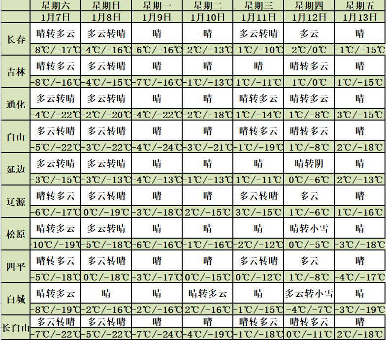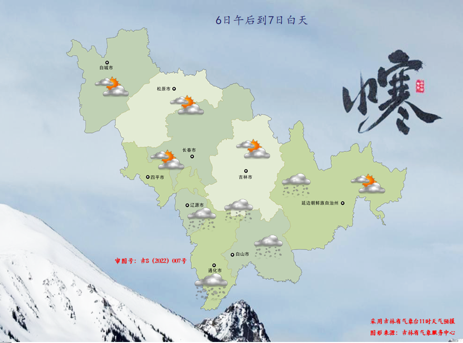 오늘 오후부터 래일 낮까지 우리 성은 구름이 많겠고 통화 남부에 작은 눈 혹은 중등정도의 눈이 내리겠다. 료원, 길림남부, 통화북부, 백산, 연변서부, 장백산보호구에 작은 눈이 내리겠다. 장춘남부 부분적 지역에 작은 눈이 내리겠다. 오늘 밤 중서부지역 최저기온은 -21~-17℃, 기타 지역은 -14~-12℃이고 래일 낮 서부지역 최고기온은 -10~-8℃, 기타 대부분 지역은 -6~-3℃에 달할 전망이다.