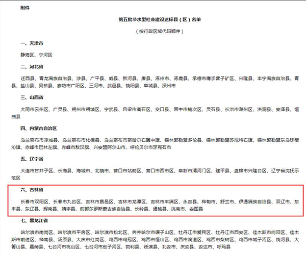제5차 절수형사회 건설 기준도달현(구) 명단(길림성 부분)