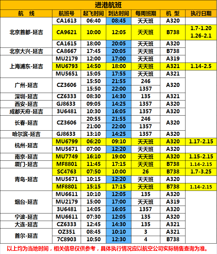 상술한 정보는 모두 현지시간이고 참고용으로서 구체 항공편 시간 집행정황은 항공회사 실제 판매 조회를 기준으로 한다.