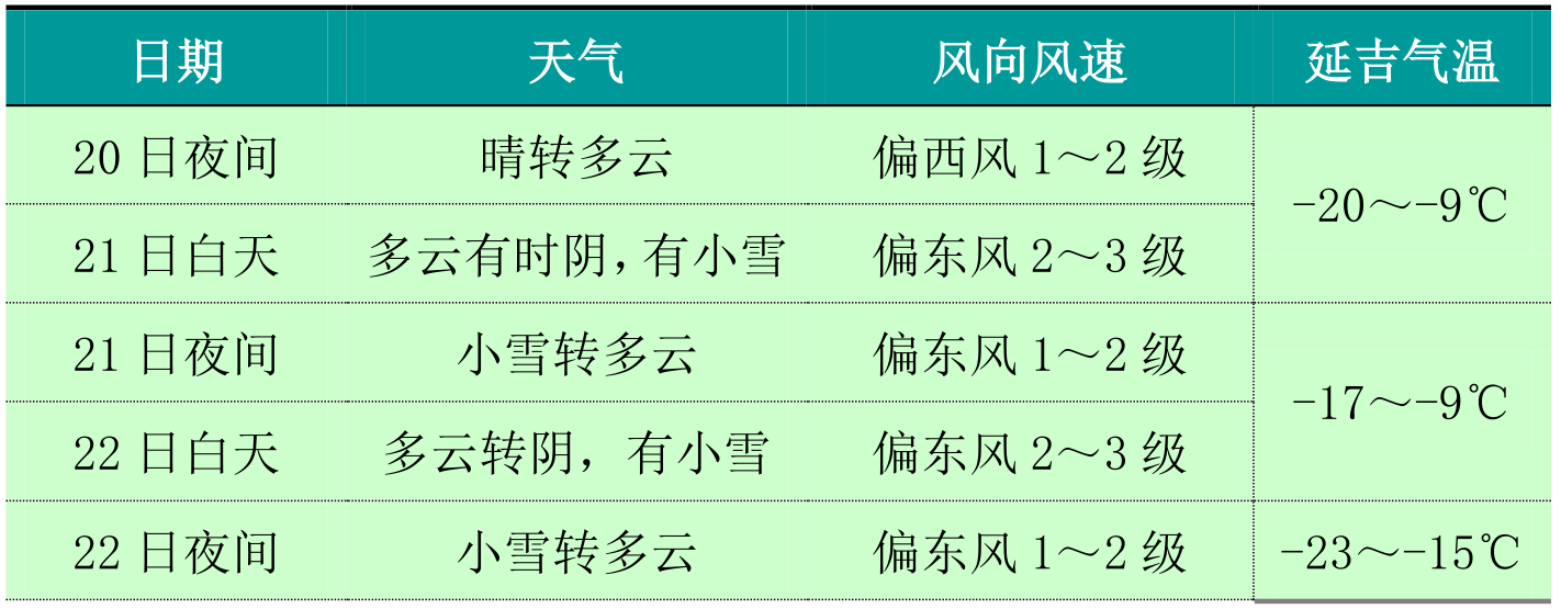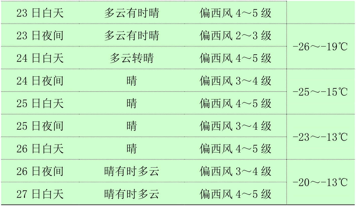 3. 23-27일, 기온이 낮고 풍력이 비교적 크며 풍한효과가 매우 뚜렷할 것으로 보인다. 도시와 농촌 군중 특히 빙설관광하는 관광객들은 방한보온에 주의 돌리고 감기와 심뇌혈관 등 질병을 예방하며 열공급기업에서는 과학적으로 열공급강도를 조절해야 한다.