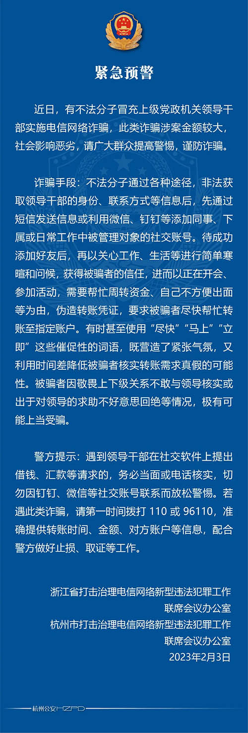 최근 일부 범죄자들은 상급 당정기관의 지도간부를 사칭하여 전신인터넷사기를 실시하는데 관련된 금액이 비교적 커서 사회적 영향이 아주 나쁘다.