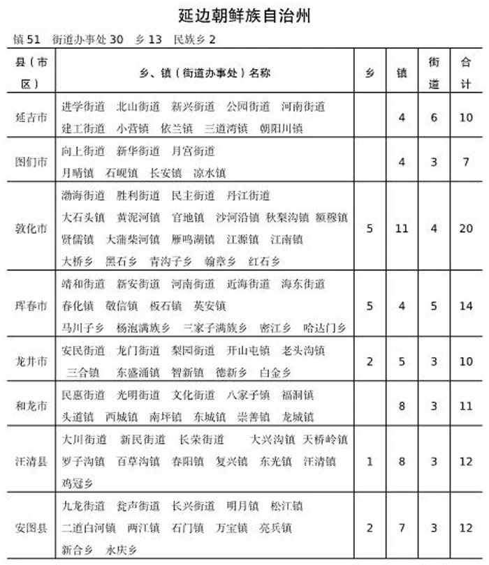 최근 길림성 향진행정구획 일람표(2021년 12월 31일)가 발부되였다. 전 성에는 도합 607개 향진이 있는데 그중 진은 426개(그중 민족진 5개), 향은 153개, 민족향은 28개, 가두판사처는 354개가 있다. 연변주는 51개 진, 30개 가두판사처, 13개 향, 2개 민족향이 있다.