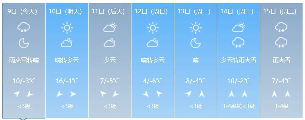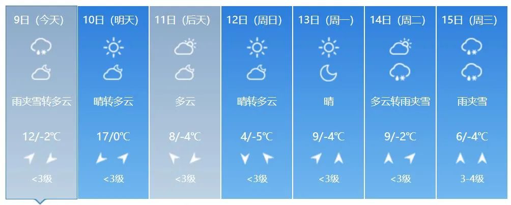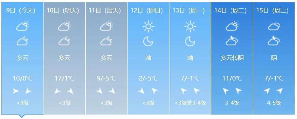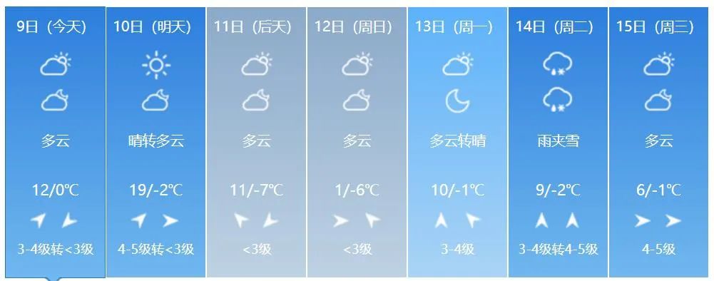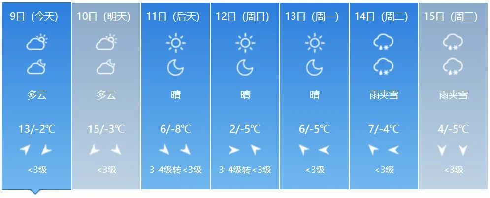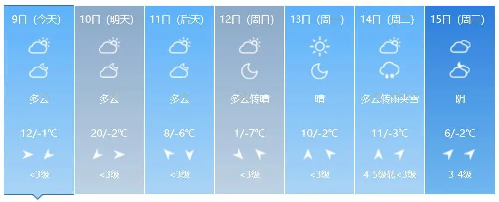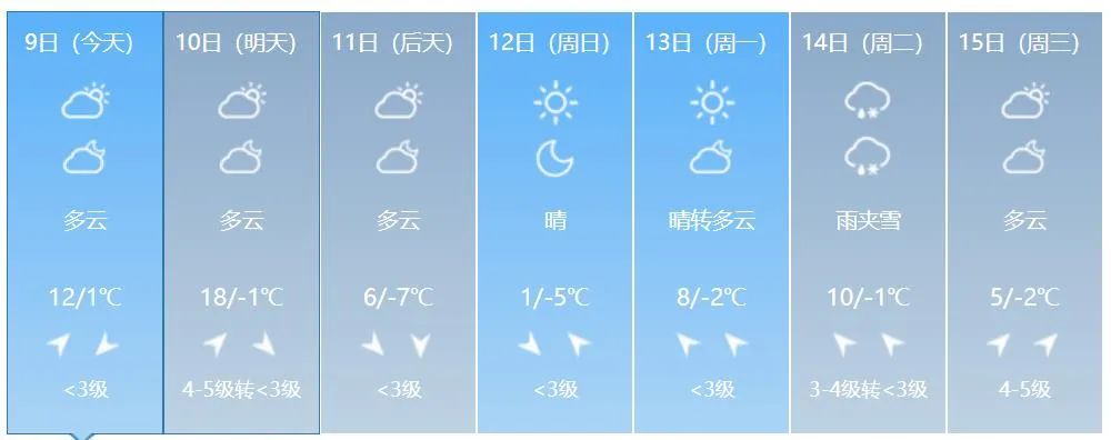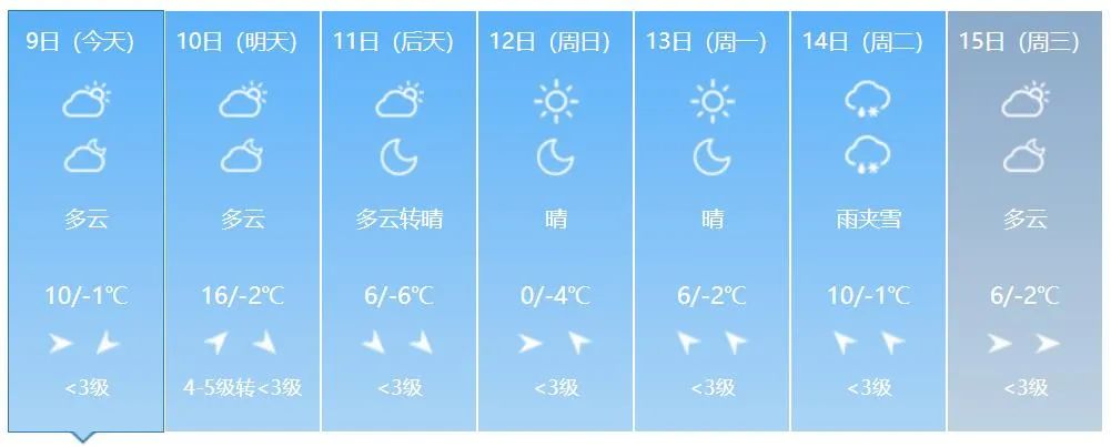 8일 저녁 전 성 대부분 지역의 최저기온은 5~-1 ℃이고 9일 낮 전 성 대부분 지역의 최고기온은 8~12 ℃이다.