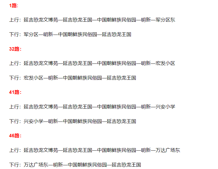 1선, 32선, 41선, 46선 공공뻐스는 원 '해란강화원'역에 도착한 후 계속해 룡상거리를 따라 연길공룡박물관 북측에 새로 증설한 '연길공룡왕국' 종착역까지 간후 승객들을 하차시키고 차량은 지정된 위치에서 정차한다. 돌아갈때 4갈래 공공뻐스는 연길공룡왕국 원내의 시발역인 '연길공룡문박원'에서 출발해 룡상거리를 따라 원 '해란강화원'역까지 운행한 후 원래 로선대로 운행한다.
