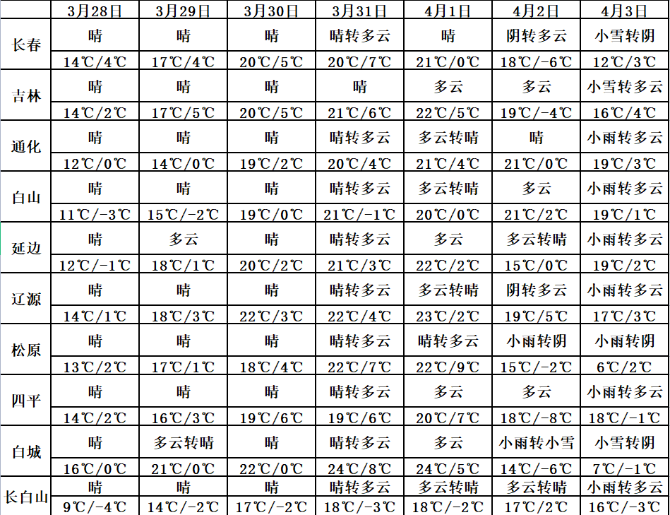 이번 주(3월 27일-4월 2일) 전 성의 기온은 여전히 높은 편으로 평균기온은 약 6.0℃에 달할 전망이다. 강수는 적은 바 전 성의 평균 강수량은 0.1밀리미터로 예상되여 맑은 날이 많을 것이다.