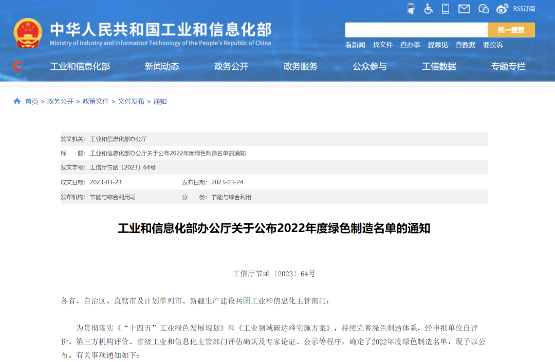 일전 공업과정보화부는 공식 홈페이지를 통해 2022년 록색제조명단을 발표했다. 그중에는 록색공장 874개, 록색설계제품 643개, 록색공업단지 47개, 록색공급사슬관리기업 112개가 포함되였다.