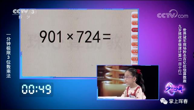 60초라는 시간내에 장육몽은 25개의 세자리수 곱셈을 정확하게 답해야 도전에 성공할 수 있었다. 이 난이도는 많은 성인 선수들에게도 불가능한 것이다! 그 원인은 도전자의 암산수준 뿐만 아니라 손놀림속도와 심리상태도 시험해야 하기때문이다. 단 하나의 문제나 한개의 수자가 잘 보이지 않으면 최종 도전 결과에 영향을 줄 수 있다!