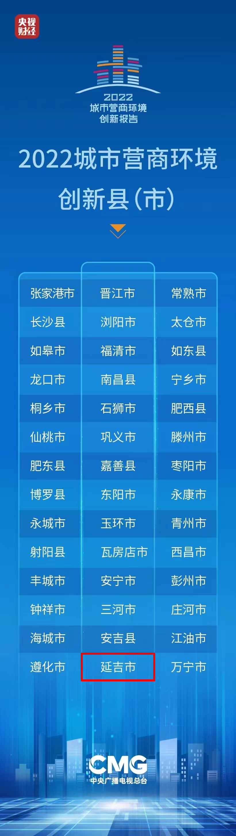 중앙TV방송총국《2022 도시경영환경혁신보고》가 4월 3일, 북경에서 정식으로 발표됐다. 그중 연길시가 우수한 경영환경으로 "2022 도시경영환경 혁신현(시)" 명단에 올라 연길시가 효과적으로 시장 활력을 불러일으키고 경영환경을 개선하는 데서 큰 성과를 거두었음을 잘 보여준다.