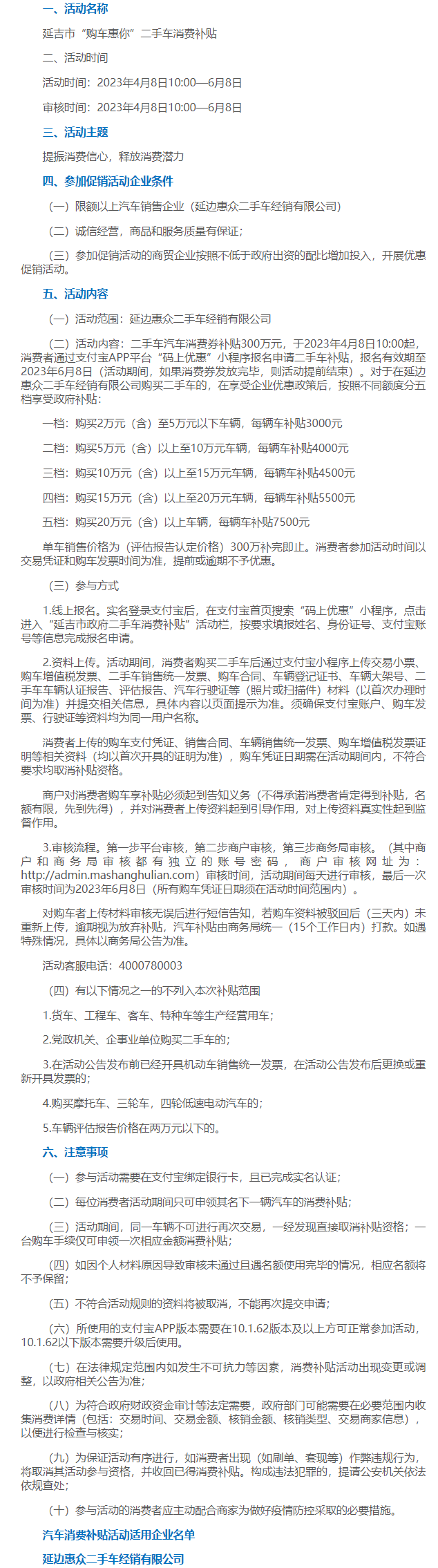 20차 당대회 정신 및 소비절에 관한 성, 주, 시의 사업요구를 관철, 시달하고 시장신심을 일층 진작시키고저 연길시는 2023년 4월 8일부터 300만원을 투입하여 중고차소비 보조금활동을 전개하기로 결정했다. 구체 활동방안은 다음과 같다.