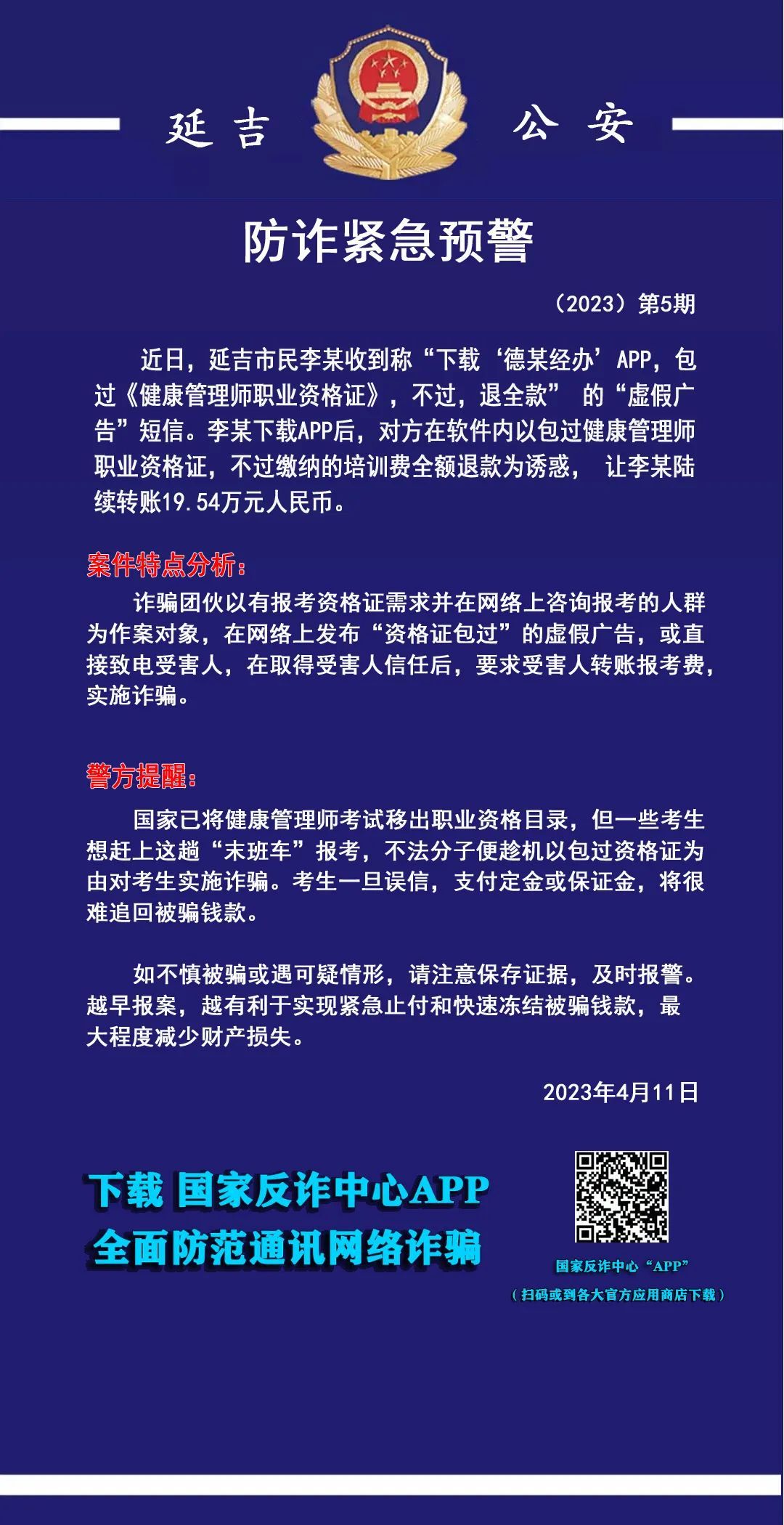 일전, 연길시민 리모는 "'덕모취급'APP을 다운로드하면 <건강관리사 직업자격증> 시험을 통과시켜줄 수 있으며 통과하지 못할 경우 전액을 환불해준다"는 '허위광고' 메시지를 받았다. 리모가 APP을 다운로드한 후 상대방은 APP에서 건강관리사 직업자격증 시험을 무조건 통과시키며 통과하지 못할 경우 납부한 강습비용 전액을 환불해준다며 리모로 하여금 륙속 19만 5,400원을 이체하도록 했다.