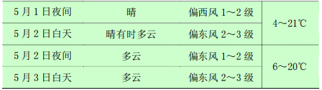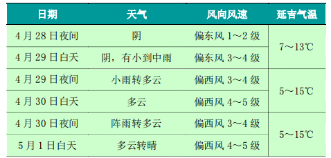 4. 4월 30일-5월 1일, 풍력이 비교적 큰 데다가 명절 후반에 강수가 없어 삼림화재위험 기상등급이 높겠으므로 각지에서는 삼림초원 방화사업을 강화하고 도시와 농촌 주민들은 관광 및 봄갈이생산에서 야외불사용을 엄금하여 화재가 발생하지 않도록 주의해야 한다.
