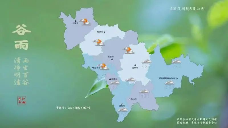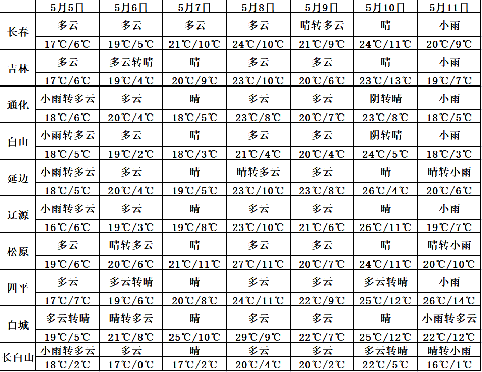 4일 밤부터 5일 낮까지 전 성에는 구름이 많이 끼다가 이따금 흐리겠고 통화 남부, 백산, 연변 남부, 장백산보호구에는 중등 정도의 비가 내리겠는데 그중 통화 남부 부분적 지역에는 큰비가 내리겠다. 이밖에 료원, 길림 남부와 동부, 통화 북부, 연변 북부에는 적은 비가 내리겠다.