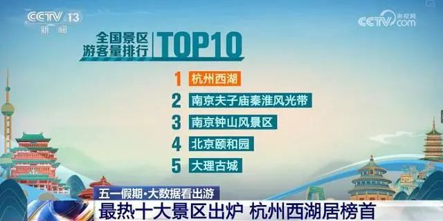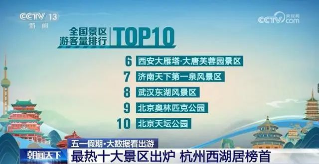 4월 29일 령시부터 5월 1일 16시까지 전국 관광객 방문량 순위 앞 10위를 차지한 풍경구들로는 다음과 같다.