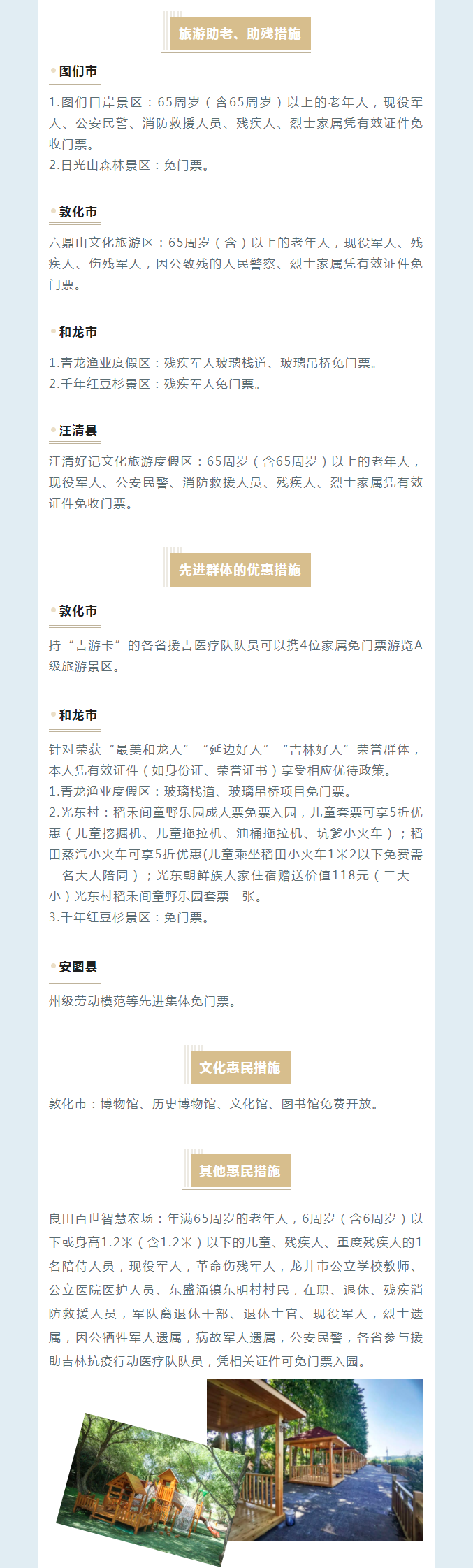 1. 석문진민속풍정원, 송화조선족민속촌, 장백산보석소진관광리조트, 장백산제1풍경국(내두산촌), 장백산대관동문화원, 화계곡, 대립자촌, 장백산력사문화원 5월 19일 당일 입장료 무료.