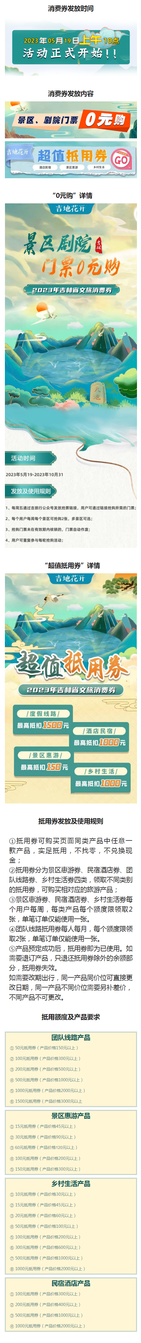 새로운 문화관광소비 포인트를 적극 발굴하고 '고객 길림 진입' 계획을 효과적으로 실시하며 문화관광산업의 쾌속 발전을 추동하고저 이번 활동은 국내외 관광객들을 대상으로 펼쳐지게 된다. 이번에 성급 자금 도합 1천만여원을 투입하여 2023년 5월 19일 10시에 2023년 길림 여름철 문화관광소비권을 발급하게 된다. 이 시간대에 위챗공식계정 '길려행(吉旅行)' 플랫폼에서 무료 풍경구 티켓과 문화관광제품 할인권을 발급하게 되는데 풍경구, 리조트, 향촌관광경영단위, 성급 음식점, 려행사, 등급 민박, 문화관광 연예장소 등 7대류 130여개 문화관광기업이 포함되며 성내 관광을 이끌고 길림성 문화관광업종의 경제발전을 촉진하게 된다.
