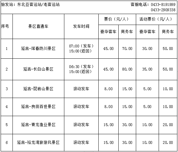5월 19일은 13번째 '중국 관광의 날'이다. 우리 주는 '아름다운 연변, 행복한 려정'을 주제로 한 계렬 활동을 펼치게 된다. 연변동북아려객운수그룹은 이번 활동을 계기로 대중관광 추진에 심입하고 인민군중의 아름다운 생활수요를 만족시키며 '당신의 수요는 우리가 봉사'한다는 봉사리념을 힘써 보급하고 광범한 관광객들이 레저관광에 참여하도록 흡인하기 위해 5월 19일부터 21일까지 아래와 같은 정품 관광풍경구 선로 직통차 우대활동을 출시했다.