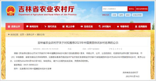 최근 길림성 농업농촌부 홈페이지에는 2023년 중국 아름다운 레저향촌 추천예정 명단에 대한 공시가 발표되였다. 현급 농업농촌부문의 조직신청, 시(주) 심사추천, 성급 전문가 종합심사 등의 절차를 거쳐 장춘 정월첨단기술산업개발구 옥담진 우호촌 등 8개 성급 아름다운 레저향촌을 2023년 중의 아름다운 레저향촌으로 추천할 예정이다.
