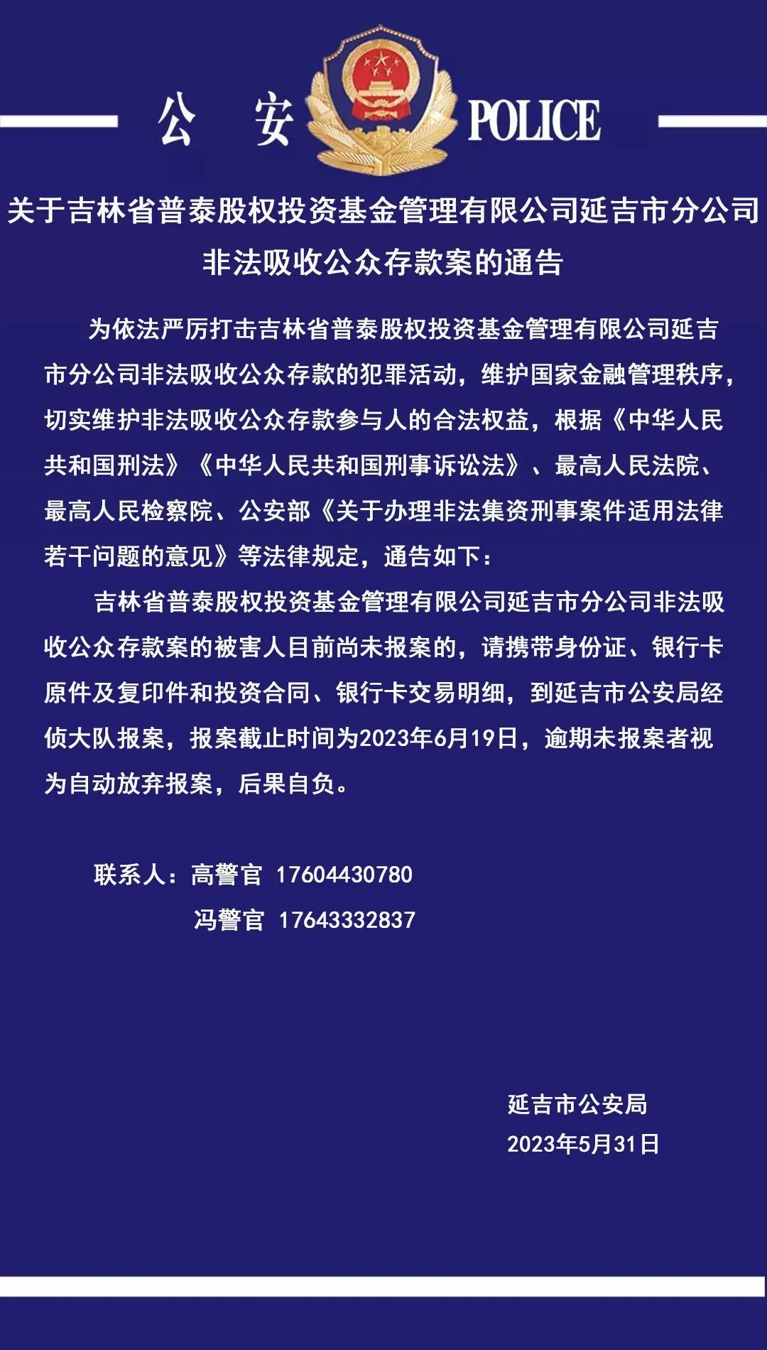 길림성보태주식투자기금관리유한회사 연길시분회사에서 공중의 예금을 불법 흡수한 범죄활동을 법에 따라 엄하게 타격하고 국가 금융관리질서를 수호하며 공중 예금 불법 흡수에 참여한 사람의 합법적 권익을 절실히 수호하기 위해 <중화인민공화국형법> <중화인민공화국형사소송법>, 최고인민법원, 최고인민검찰원, 공안부 <불법모금형사사건을 처리함에 있어서 법률적용의 약간한 문제에 관한 의견> 등 법률 규정에 따라 아래와 같이 통고한다.