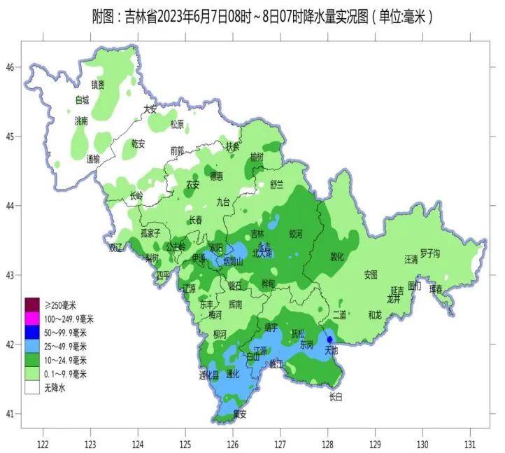 동북 한랭저기압골과 인공증우작업의 공동 영향으로 6월 7일 아침부터 우리 성에는 소나기 날씨가 나타났다. 6월 8일 7시까지 전 성 평균 강수량은 8.3mm에 달했다. 이 기간 중동부 부분적 지역에는 강대류날씨가 나타났는바 장춘, 사평과 길림 부분적 지역에는 우박이 쏟아지기도 했다.