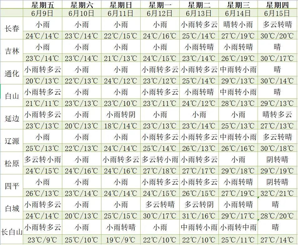 6월 8일 오후부터 9일 낮까지 전 성에 구름이 많고 이따금 흐리겠으며 연변 동부에 중등정도의 비가 내리던 데로부터 큰비가 내리겠으며 부분적 지역에는 폭우가 예상된다. 통화 남부 백산 남부, 연변 서부, 장백산보호구에 적은 비 내지 중등정도의 비가 있겠고 부분적 지역에는 큰비가 내릴 것으로 예상된다. 상술한 지역 부분적 곳에서는 단시간내 강우, 천둥번개를 동반한 소나기, 강풍, 우박 등 강대류 날씨가 나타나게 되며 기타 지역에는 소나기 혹은 천둥번개를 동반한 소나기날씨가 나타날 것으로 보인다.