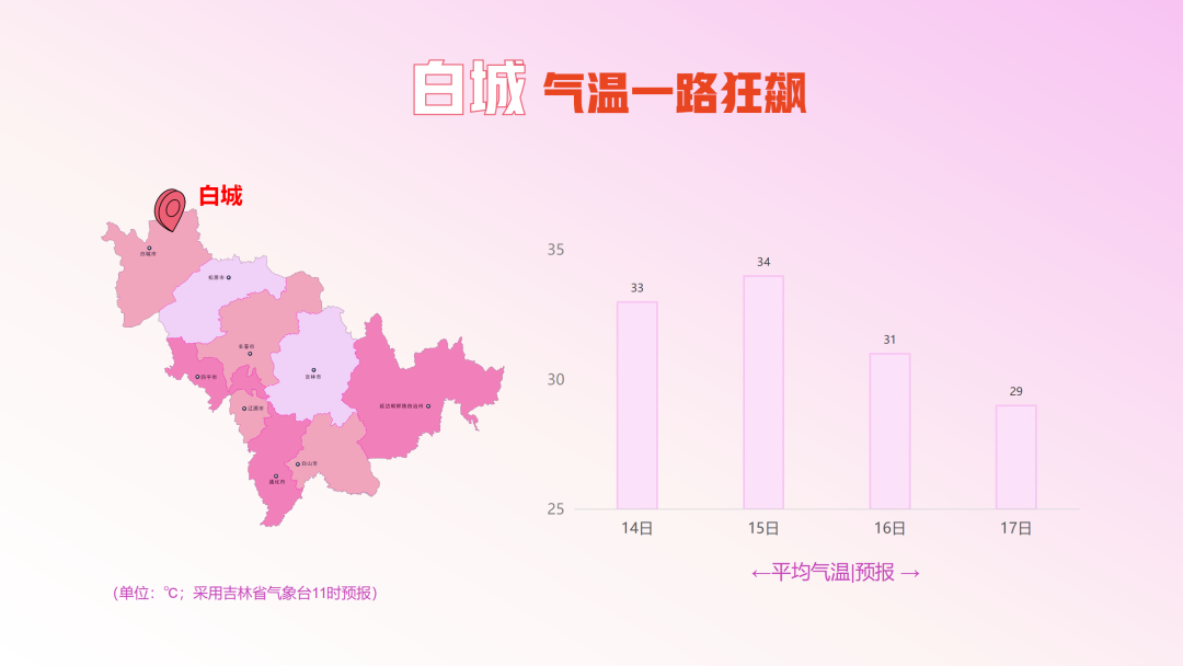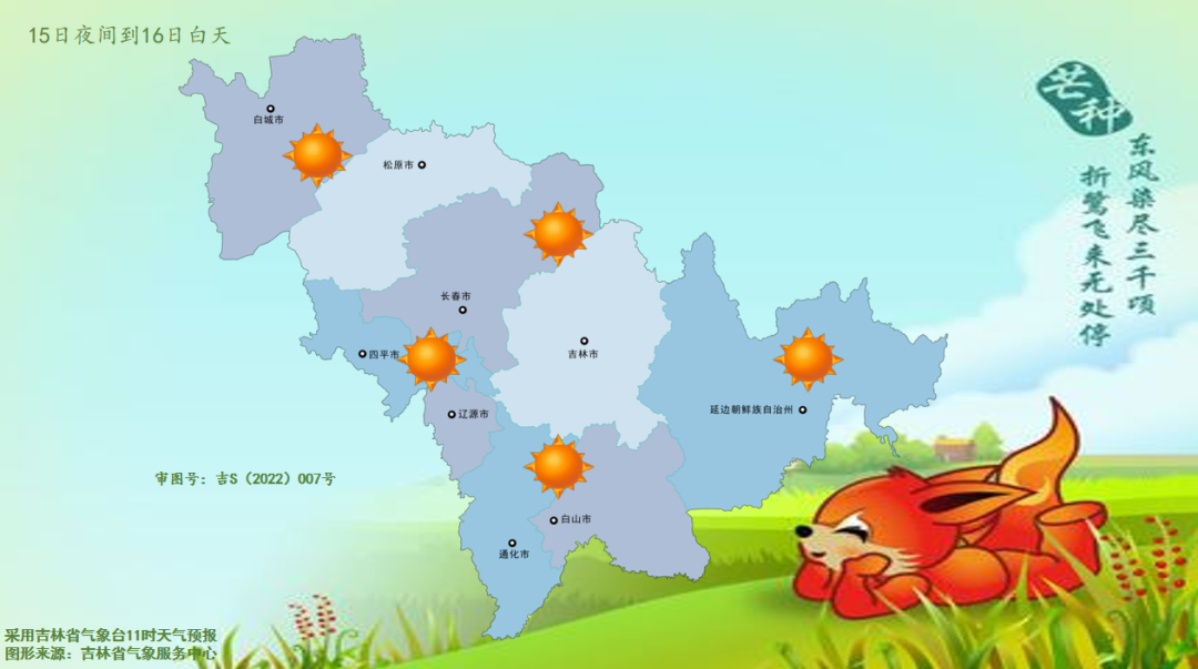 강수날씨가 점차 물러나면서 래일부터 길림성 기온은 서-동방향으로 신속히 상승할 것으로 보이는 가운데 15일 기온이 지속적으로 치솟으면서 16-18일 길림성 대부분 지역 최고기온이 30℃이상에 달하겠다. 최고기온은 17-18일 낮에 나타날 것으로 보이는 가운데 중서부와 연변 대부분 지역 최고기온은 32~34℃, 국부 지역은 35℃이상에 달하며 기타 지역 최고기온은 31℃에 달할 것으로 예상된다.