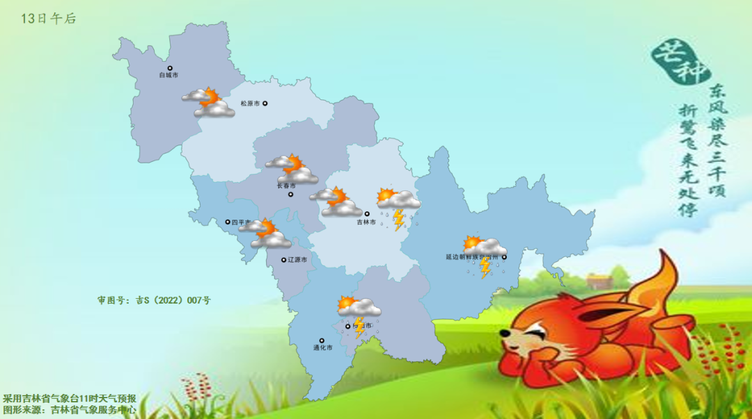 13일 오후, 길림성은 구름이 많이 끼고 길림 동부, 통화, 백산, 연변, 장백산보호구에는 소나기 혹은 천둥번개를 동반한 소나기가 내렸다. 그중 백산, 연변, 장백산보호구 부분적 지역에는 중등정도의 비가 내리고 천둥번개, 강풍, 단시간내 강우 등을 동반한 강대류 날씨가 나타났다.