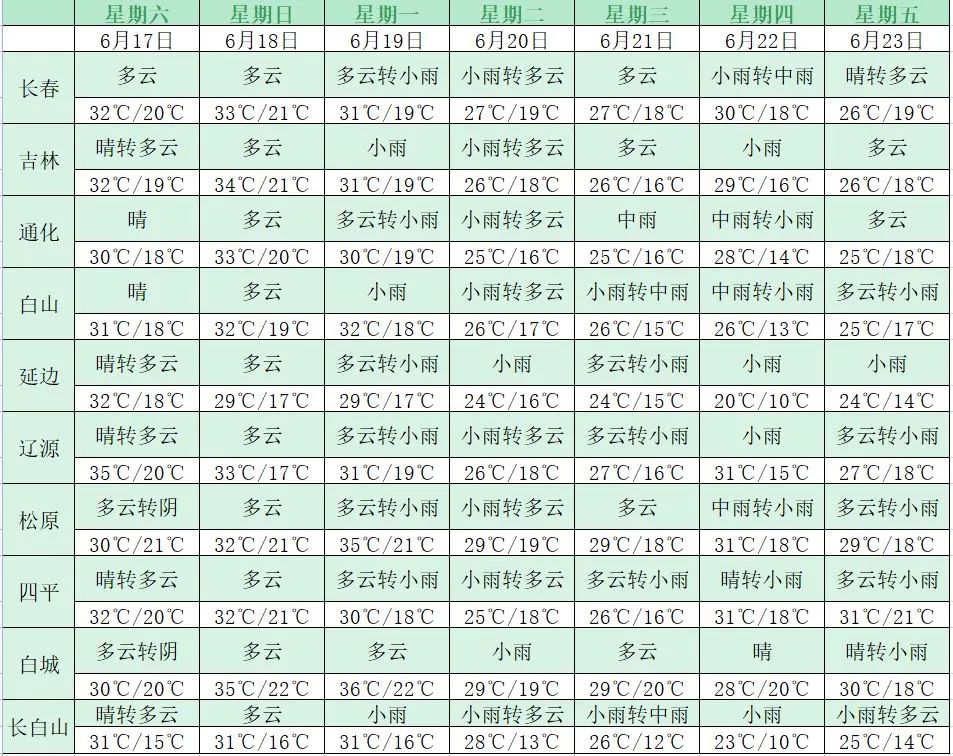 오늘 밤 백산지역의 최저기온은 15℃ 안팎이겠고 기타 지역은 16~20℃겠다. 17일 낮 료원지역의 최고기온은 35℃ 좌우겠고 기타 지역은 30~32℃겠으며 장춘시의 오늘 밤 최저기온은 20℃겠고 래일 낮 최고기온은 32℃겠다.