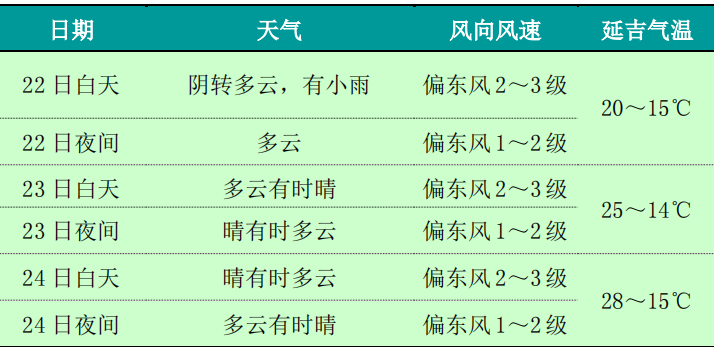 단오절기간(6월 22일-24일) 우리 주 기온은 다소 높은바 전 주 평균기온은 19.0℃ 안팎으로 평년 동기보다 0.2℃ 가량 높을 것으로 예상된다. 23일부터 기온이 뚜렷이 상승하겠고 강수는 적겠으며 22일 낮에는 적은 비가 내리겠는데 그중 돈화, 안도, 왕청의 강수량은 1밀리메터~3밀리메터겠고 기타 지역의 강수량은 4밀리메터~7밀리메터겠으며 바람은 크지 않을 것으로 예상된다.