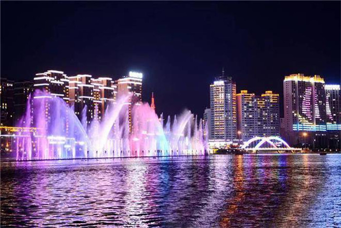 음악분수는 전체 길이가 158메터, 너비 12메터, 최고 100메터의 물기둥을 분사할 수 있으며 음악공연 '룡행천하' '하늘옥기둥' 등 여러가지 수무형태를 낼 수 있으며 조형이 풍부하고 감상성이 매우 좋으며 주변 환경과 어우러져 연길의 민족특색과 문명도시 형상을 충분히 보여주고 시민과 관광객들에게 우아하고 아름다운 시각성연을 제공하게 된다.