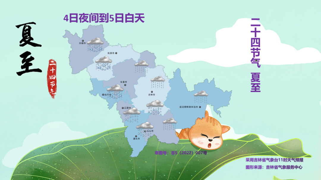 4일 밤부터 5일 낮까지는 이번 강수과정에서 폭우가 내리는 시간대로 구름이 많겠고 이따금 흐리겠다. 폭우는 주로 백성, 송원, 장춘 남부, 사평에 내리겠고 부분적 지역에 큰 폭우가 내릴 것으로 예상된다. 료원, 길림 남부, 통화, 백산 서부에는 큰비가 내리겠으며 부분적 지역에는 단시간 강수, 천둥, 강풍, 우박 등 강대류날씨를 동반하겠으며 기타 지역에는 적은비 또는 중등정도의 비가 내릴 것으로 보인다. 이 기간 강수는 범위가 넓겠으며 전 성 각지에 분포될 것으로 예상된다.
