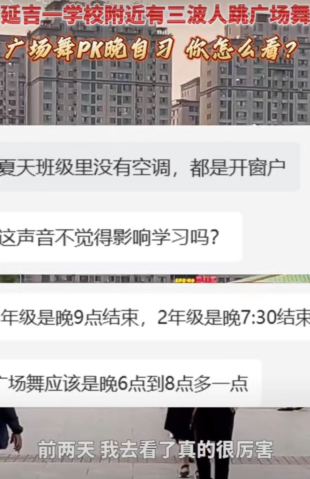 네티즌에 따르면, 이 학교 3학년은 저녁 9시에 끝나고 2학년은 저녁 7:30에 끝나는데 광장무 시간은 저녁 6시부터 8시 좌우라고 한다. 또한 여름에는 반급에 에어컨이 없어 모두 창문을 열기에 광장무 음악소리가 더욱이 학생들의 학습에 영향을 주는 것으로 추측된다.