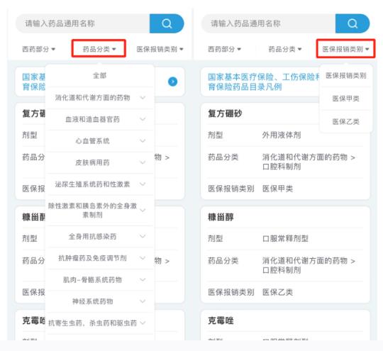 자신의 수요에 따라 ‘약품분류’ 또는 ‘의료보험 결산류형’을 선택하여 선별할 수도 있다.