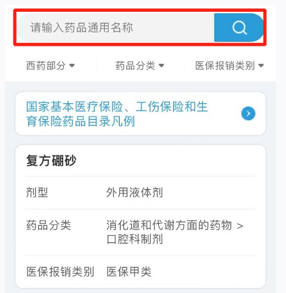 2단계: 구체적인 약품명을 입력하고 검색을 클릭하면 해당 약품이 의료보험목록의 범위내에 있는지, 소속 약품분류 및 구체적인 결산범위에 대한 자세한 정보를 알 수 있다.