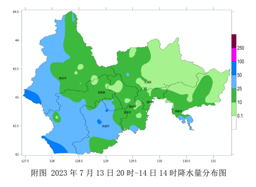 7월 13일 20시부터 14일 14시까지 연변주 대부분 지역에 중등정도의 비가 나타났고 화룡, 돈화 개별적 향진에 폭우가 내렸으며 연변주 평균강수량은 18.0밀리메터였다.