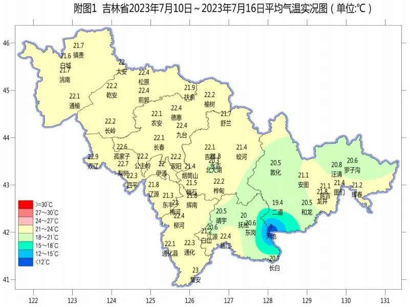 지난 주 길림성 평균기온은 21.8℃로 평년 동기대비 낮았다. 그중 백산과 연변은 평년 동기와 비슷했고 기타 지역은 평년 동기에 비해 낮았다.