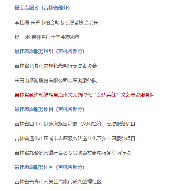 2022년 12월부터 2023년 3월까지 중앙선전부, 중앙문명판공실 등 19개 부문은 공동으로 2022년도 전국 뢰봉따라배우기 자원봉사 '4가지 100' 선진전형 선전 추천소개활동을 조직, 전개하여 가장 아름다운 자원봉사자 100명, 최고 자원봉사조직 100개, 최고 자원봉사항목 100개, 가장 아름다운 자원봉사사회구역 100개를 선정했다. 최근, 2022년도 전국 뢰봉따라배우기 자원봉사 '4가지 100' 선진전형명단이 발표되였는데 길림성에서 도합 9개 선진전형이 입선되였으며 그중 연변주에서 1개가 입선되였다.