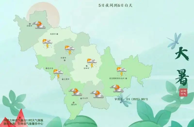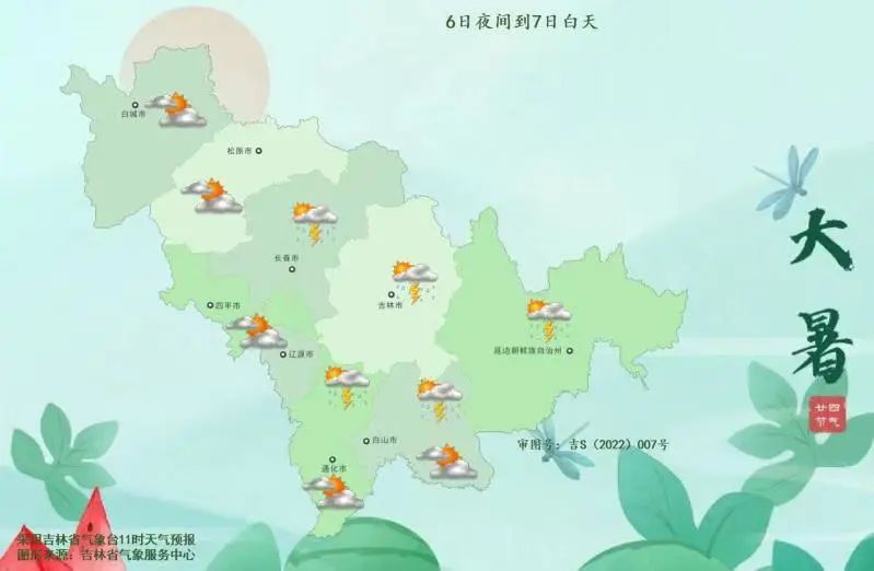 6일 밤부터 7일 낮까지 길림성운 구름이 많고 장춘, 길림, 통화 북부, 백산 북부, 연변, 장백산보호구에 소나기 혹은 천둥번개를 동반한 소나기가 내리겠다.