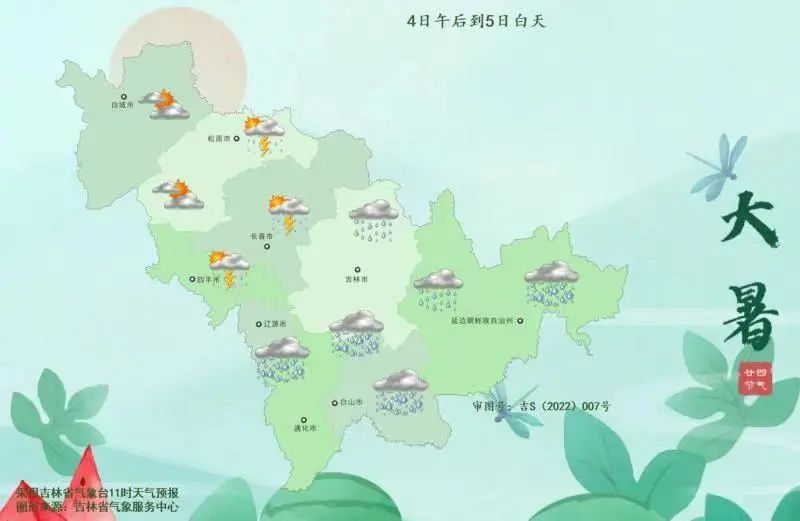 5일 밤부터 6일 낮까지 길림성은 구름이 많고 송원, 장춘, 사평, 료원, 길림, 연변 북부에 소나기 혹은 천둥번개를 동반한 소나기가 내릴 것으로 보인다.