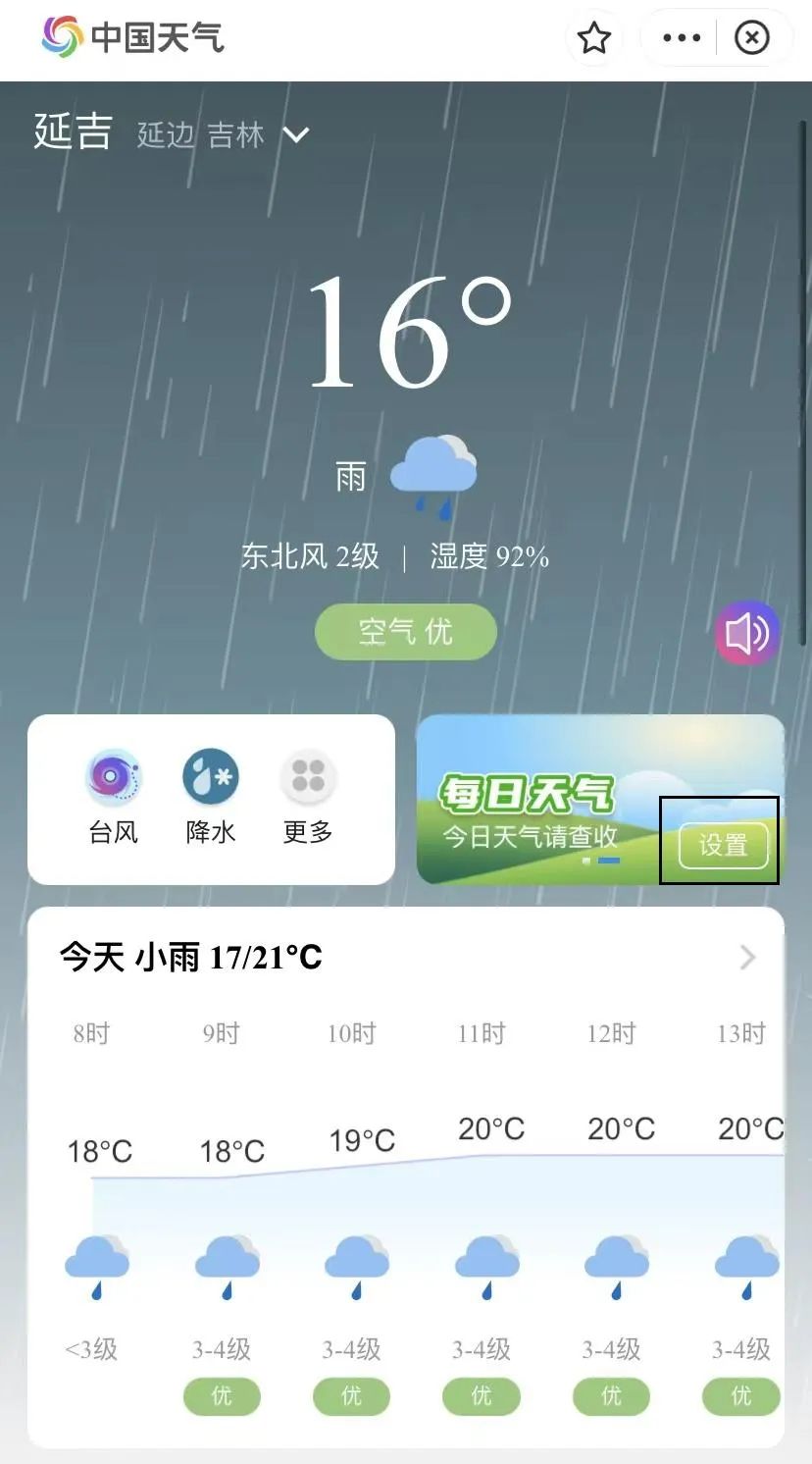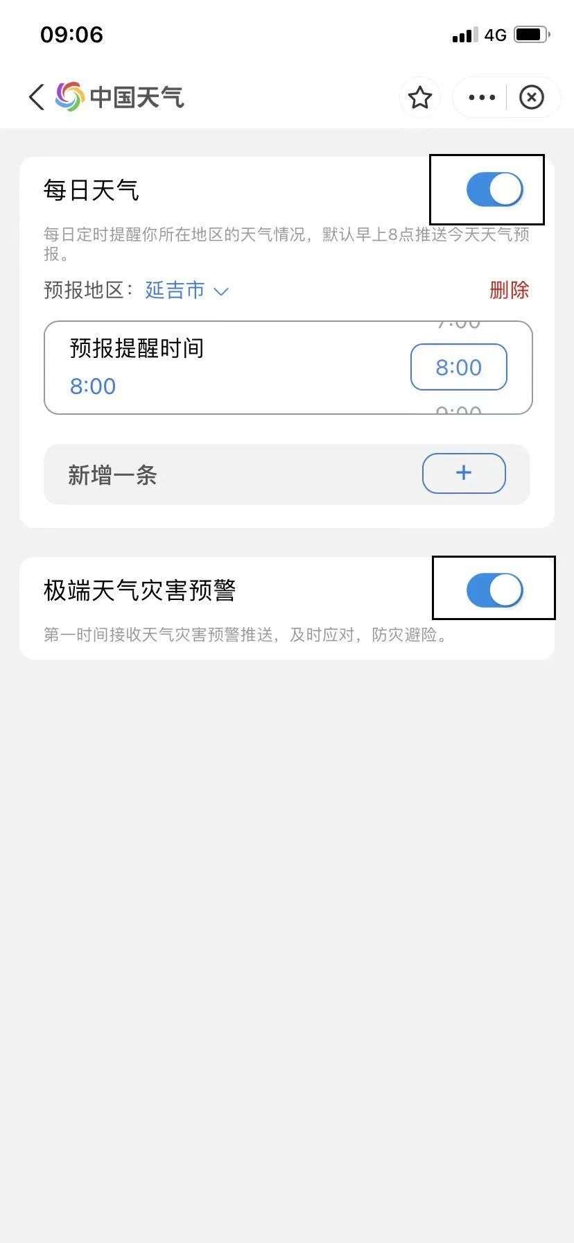 4. '매일 날씨"와 '극단적인 기상재해 조기경보' 버튼을 열고 매일 받는 날씨예보의 시간을 설정하면 극단날씨가 있게 되면 제때에 주의보가 제시된다.