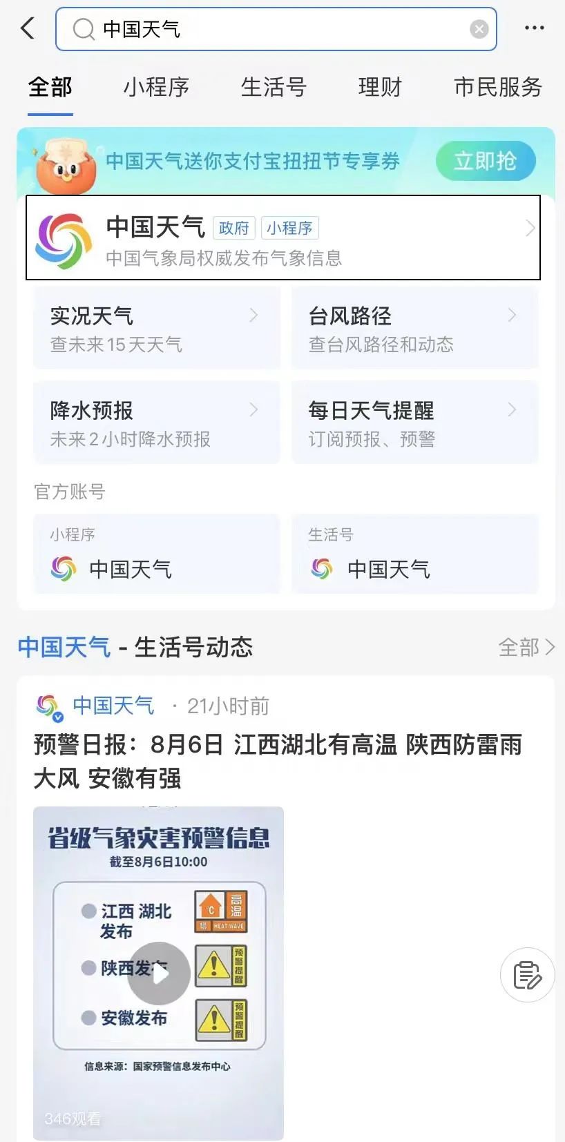 1. 먼저 핸드폰 위치기능을 켠 다음 알리페이 핸드폰 app를 다운받고 페이지에 들어간 후 '중국날씨" 미니 응용프로그램을 검색한다.