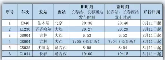 3. 8월 11일부터, 장춘-길림C1225편을 새로 증가하며 장춘역에서 16:55에 출발한다.
