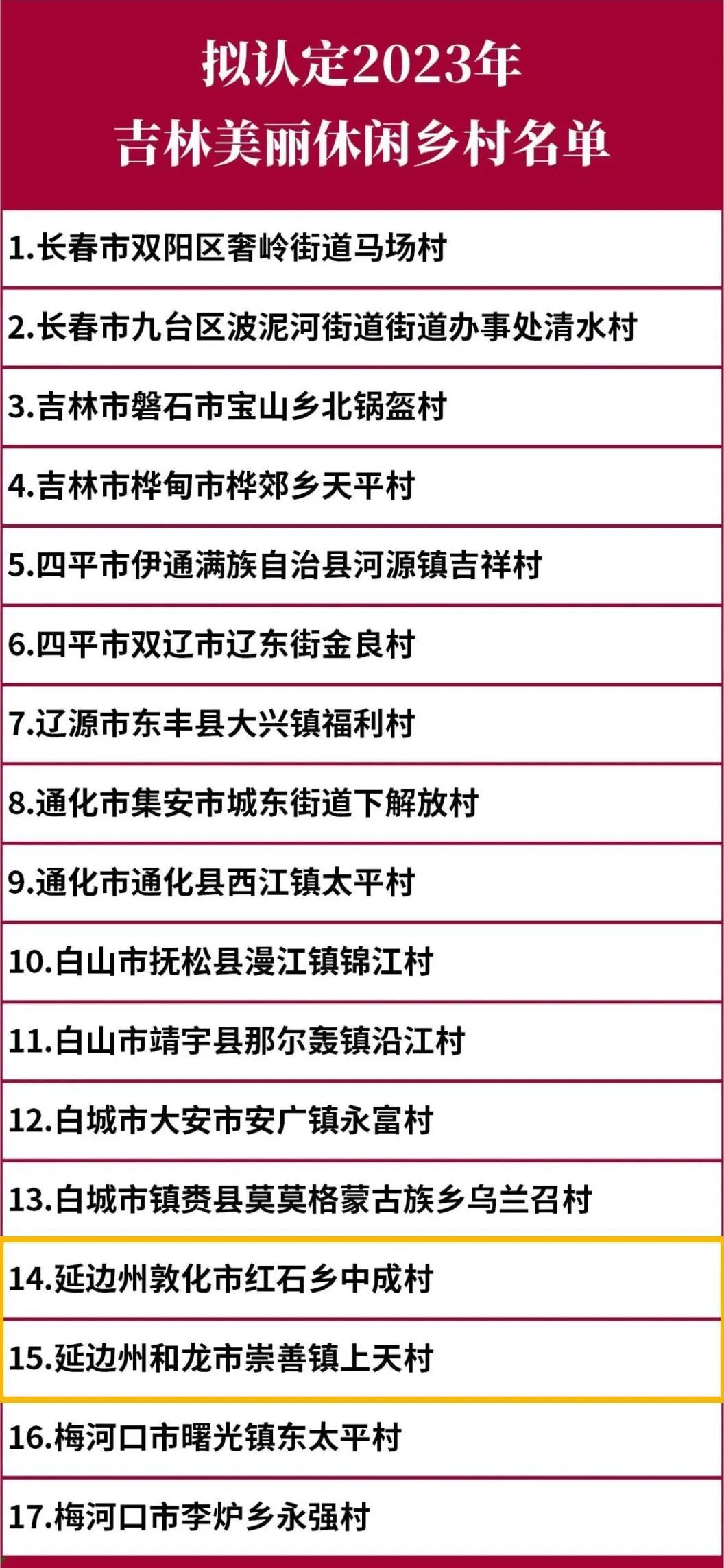 일전, 길림성농업농촌청은 2023년 길림 아름다운 레저향촌 명단을 공시했다. 길림성 행정촌 17개가 입선되였는데 그중 연변주에는 돈화시 홍석향 중성촌과 화룡시 숭선진 상천촌이 이름을 올렸다.