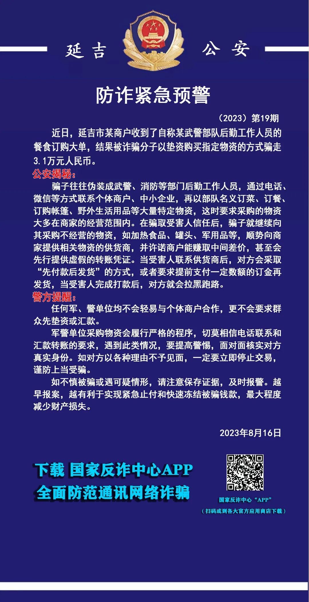 군대, 경찰 단위는 물자를 구매할 때 엄격하게 질서를 지켜야 하므로 전화련계와 입금 요구를 절대로 믿지 말아야 한다. 만약 이와 비슷한 정황이 발생하면 경각성을 높이고 직접 만나서 상대방의 진실된 신분을 확인해야 한다. 상대방이 각종 리유를 대면서 만남을 거절할 경우 반드시 즉시 거래를 중단해야 한다.