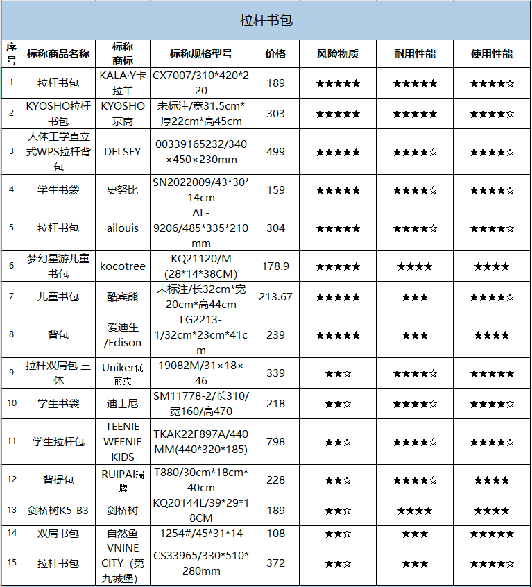 본 샘플에서 등받이 책가방의 각 항목의 테스트 지표가 바퀴달린 책가방보다 량호했다. 개별적인 바퀴달린 책가방은 2가지 테스트 지표가 시험요구를 통과하지 못한 상황이 존재했다.