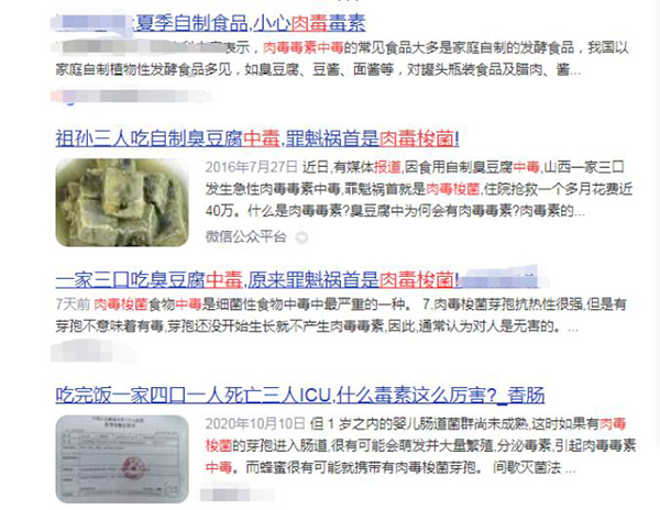 1. 과거 조사에 따르면 가정에서 직접 만든 발효식품과 절인 식품, 례하면 절인 고기, 소금에 절여 바람에 말린 고기, 김치, 두치(豆豉), 두반장, 발효두부 및 취두부 등은 중독의 ‘원흉’이 될 수 있다.