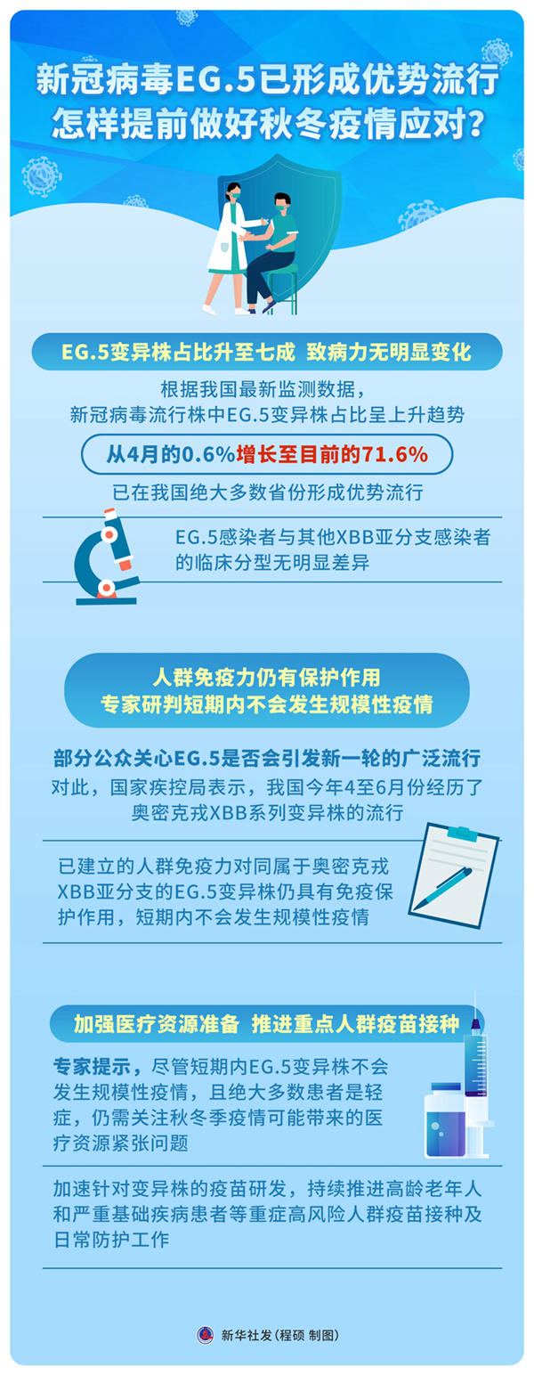 전문가는 비록 단기간내 EG.5 변이주로 규모적인 전염병상황이 발생하지 않을 것이라면서 절대다수 환자들은 증상이 가벼울 것이지만 여전히 가을, 겨울철 전염병상황으로 인한 의료자원부족문제를 주목해야 한다고 했다. 또한 변이주에 대한 백신연구개발을 다그치고 고령로인과 엄중한 기저질환이 있는 환자 등 중증 고위험군체의 백신접종 및 일상 보호작업을 지속적으로 추진해야 한다고 당부했다.