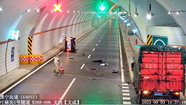9월 3일 오후, G4012 률양-녕덕 고속도로 엽마첨턴넷에서 소형차 한대가 터널 우측 정비벨트를 들이받아 옆으로 전복되고 부속품들이 사방에 흩어져있었으며 차 안에 있던 3명이 갇혀서 빠져나오지 못하는 위험한 상황에 처했다.