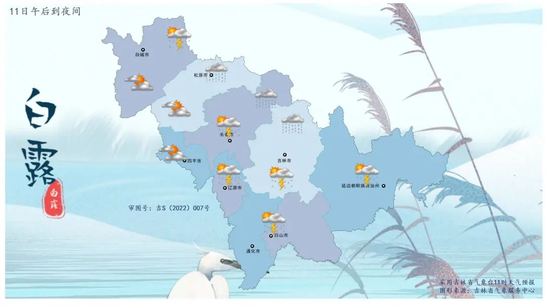 길림성은 구름이 많겠고 송원 북부, 장춘 북부, 길림 북부에는 적은 비에서 중등 정도의 비가 내리겠고 부분적 지역에는 큰 소나기가 내림과 아울러 단시간내 강한 강수가 내리겠으며 천둥번개, 강풍, 우박 등 강대류날씨가 나타나겠다. 백성 동북부, 장춘 중남부, 사평 동부, 료원, 길림 남부, 통화, 백산, 연변, 장백산보호구에는 소나기 혹은 천둥 번개를 동반한 소나기가 내리겠다.