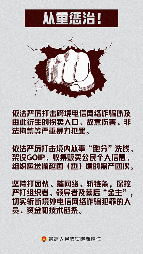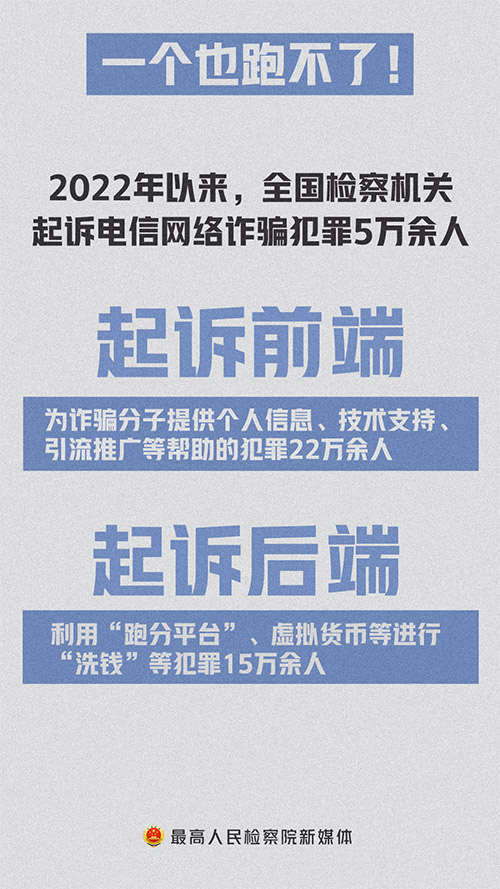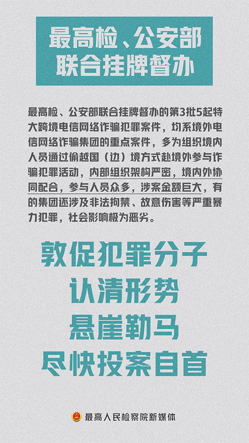 최근 최고인민검찰원과 공안부는 공동으로 3차수 5건의 대규모 다국적 전신사기범죄 사건을 공개적으로 조사하고 내외 련동을 통해 범죄조직, 네트워크, 범죄사슬, 조직자, 지도자와 배후의 ‘금주’를 깊이 파헤쳐 사회안정과 인민의 중요한 리익을 효과적으로 수호했다.